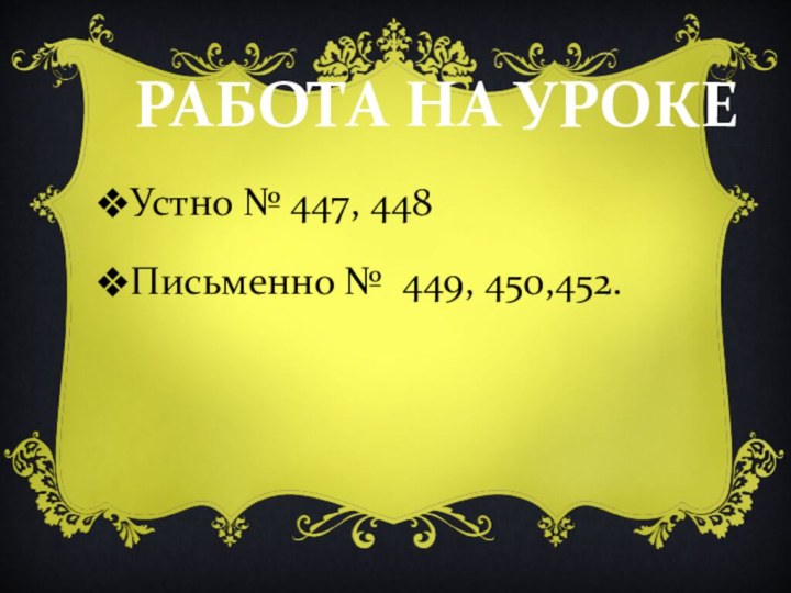 РАБОТА НА УРОКЕУстно № 447, 448Письменно № 449, 450,452.