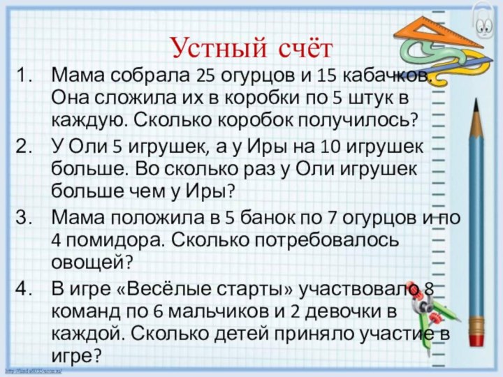 Мама положила в 5 банок по 7 огурцов и по 4 помидора. Сколько потребовалось овощей?