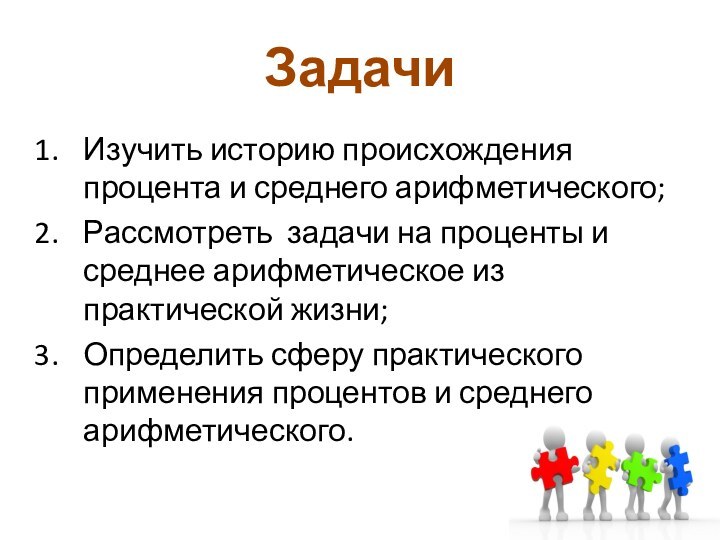 ЗадачиИзучить историю происхождения процента и среднего арифметического; Рассмотреть  задачи на проценты