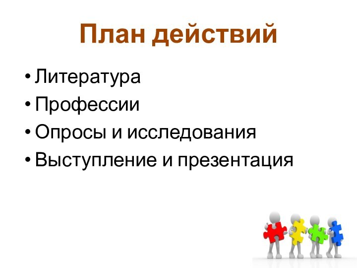 План действийЛитератураПрофессииОпросы и исследованияВыступление и презентация