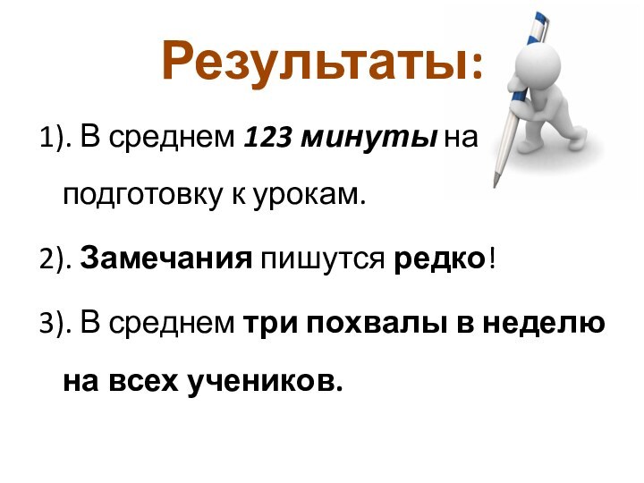 Результаты: 1). В среднем 123 минуты на подготовку к урокам.2). Замечания