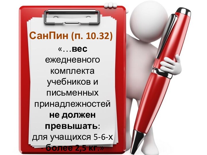 СанПин (п. 10.32)«…вес ежедневного комплекта учебников и письменных принадлежностей не должен