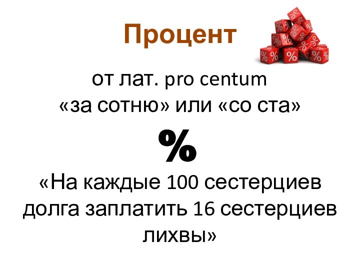 Процентот лат. pro centum «за сотню» или «со ста»cto «На каждые 100 сестерциев долга заплатить 16 сестерциев лихвы»%
