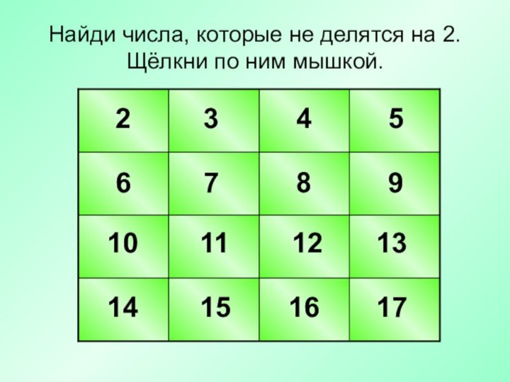 Найди числа, которые не делятся на 2. Щёлкни по ним мышкой. 234567891012111314151617
