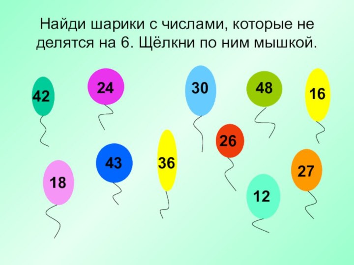 Найди шарики с числами, которые не делятся на 6. Щёлкни по ним мышкой.