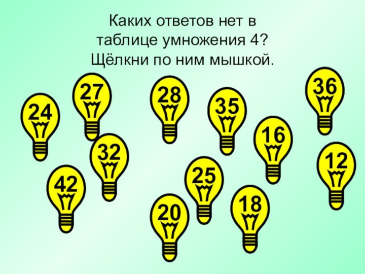 Слайд 4 Каких ответов нет в таблице умножения 4? Щёлкни