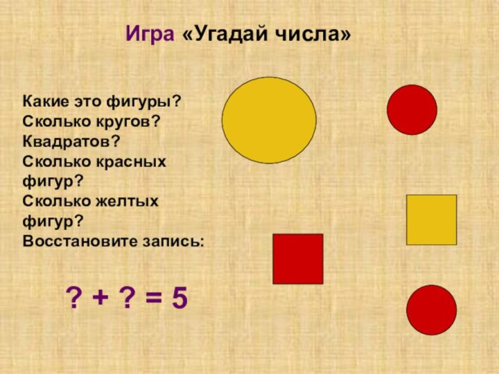 Игра «Угадай числа»Какие это фигуры?Сколько кругов? Квадратов?Сколько красных фигур?Сколько желтых фигур?Восстановите запись:? + ? = 5