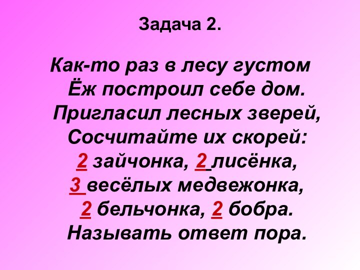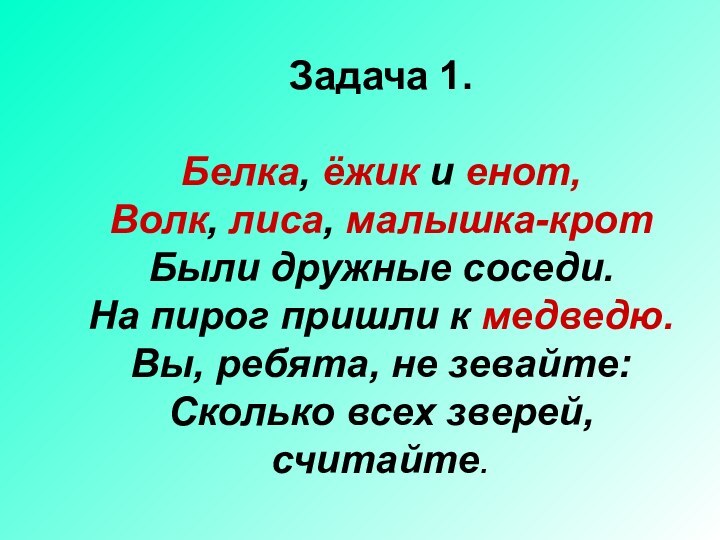 Задача 1.Белка, ёжик и енот,Волк, лиса, малышка-крот Были дружные соседи. На