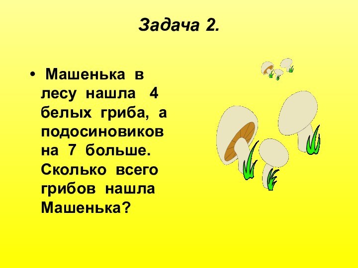 Задача 2. Машенька в лесу нашла 4 белых гриба, а подосиновиков
