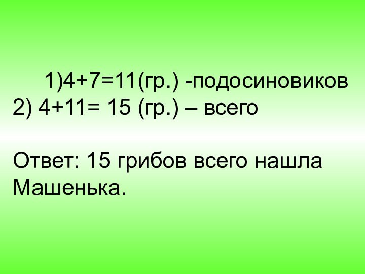 1)4+7=11(гр.) -подосиновиков 2) 4+11= 15 (гр.) – всего Ответ: 15 грибов всего нашла Машенька.