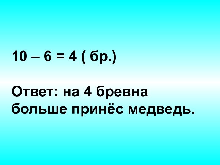 10 – 6 = 4 ( бр.) Ответ: на 4 бревна больше принёс медведь.
