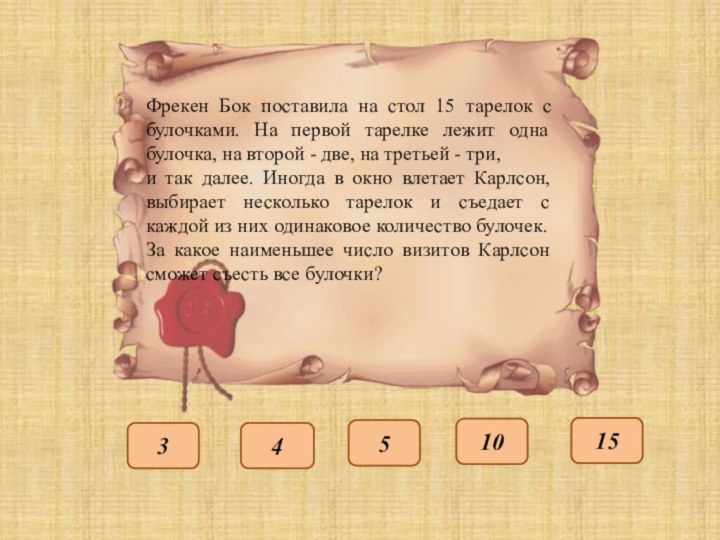 и так далее. Иногда в окно влетает Карлсон, выбирает несколько тарелок и съедает с каждой из них одинаковое количество булочек. За какое наименьшее число визитов Карлсон сможет съесть все булочки?