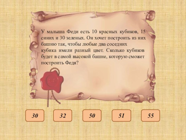кубика имели разный цвет. Сколько кубиков будет в самой высокой башне, которую сможет построить Федя?