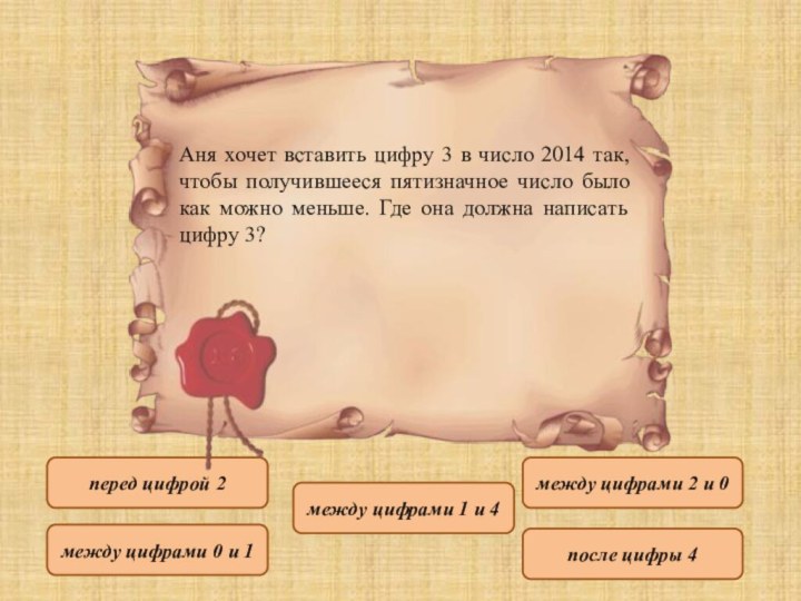 хочет вставить цифру 3 в число 2014 так, чтобы получившееся пятизначное число было как можно меньше. Где она должна написать цифру 3?