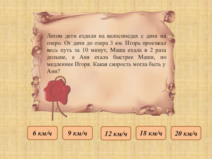 озера 3 км. Игорь проезжал весь путь за 10 минут, Маша ехала в 2 раза дольше, а Аня ехала быстрее Маши, но медленнее Игоря. Какая скорость могла быть у Ани?
