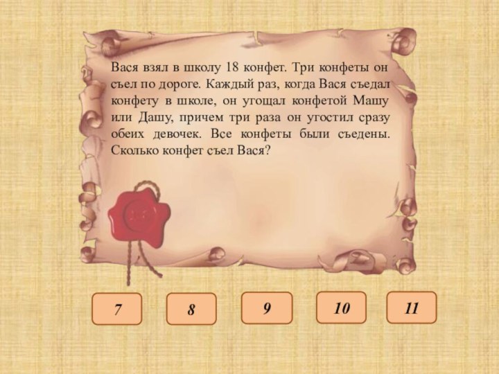 конфету в школе, он угощал конфетой Машу или Дашу, причем три раза он угостил сразу обеих девочек. Все конфеты были съедены. Сколько конфет съел Вася?