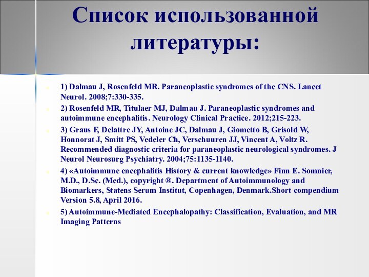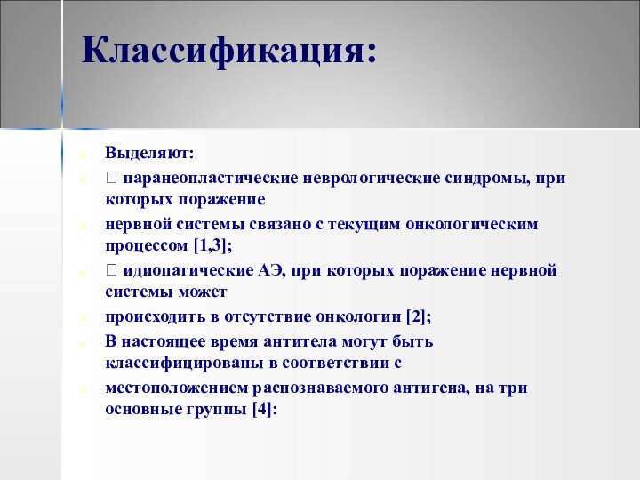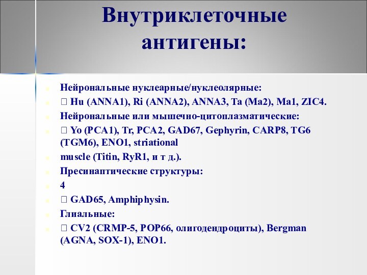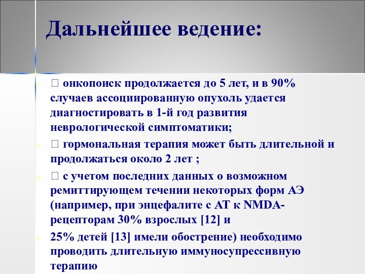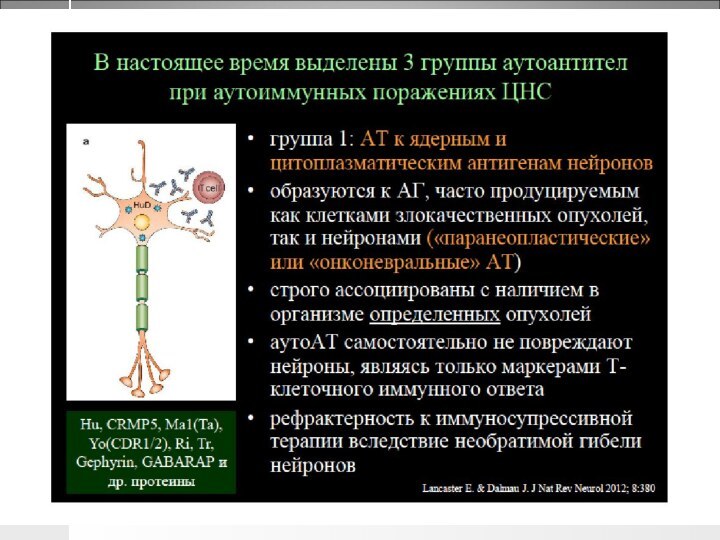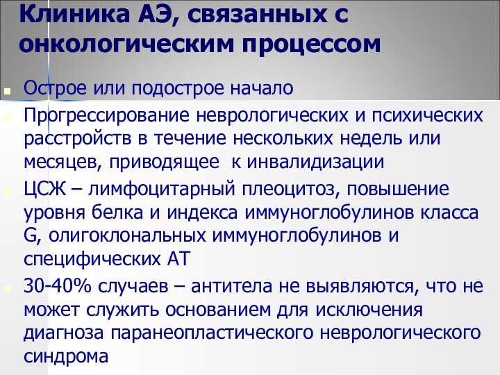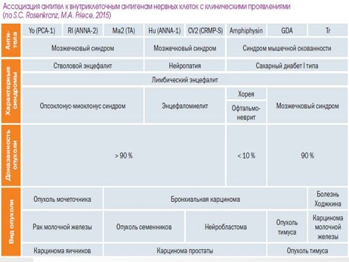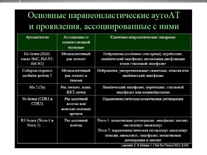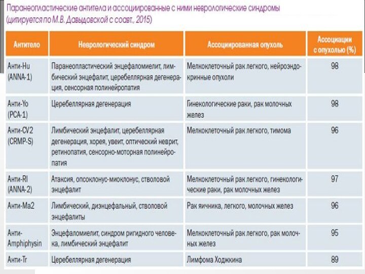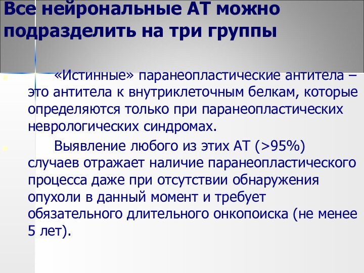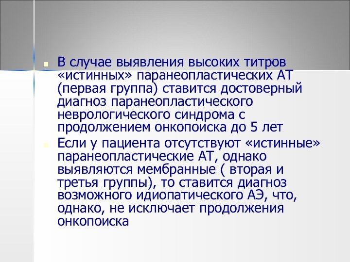 Выявление любого из этих АТ (>95%) случаев отражает наличие паранеопластического процесса даже при отсутствии обнаружения опухоли в данный момент и требует обязательного длительного онкопоиска (не менее 5 лет).