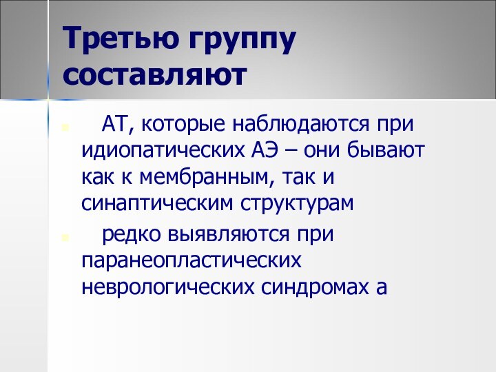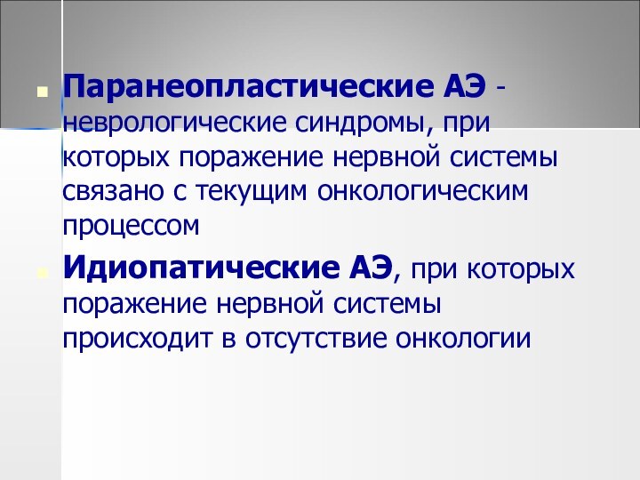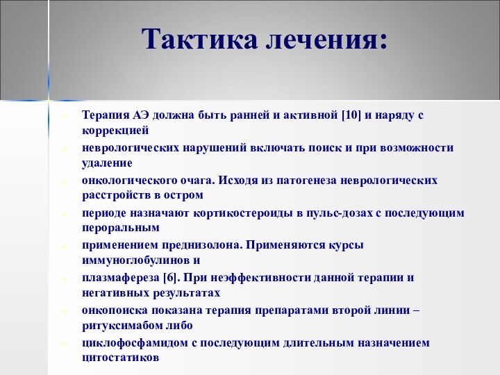 Если у пациента отсутствуют «истинные» паранеопластические АТ, однако выявляются мембранные ( вторая и третья группы), то ставится диагноз возможного идиопатического АЭ, что, однако, не исключает продолжения онкопоиска
