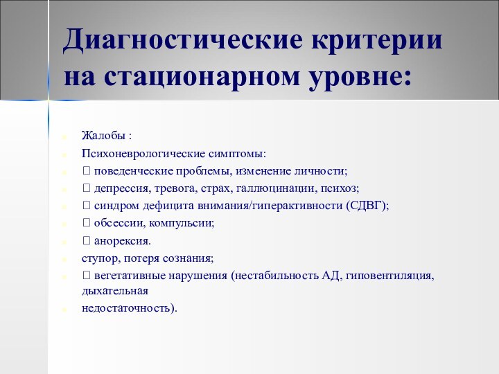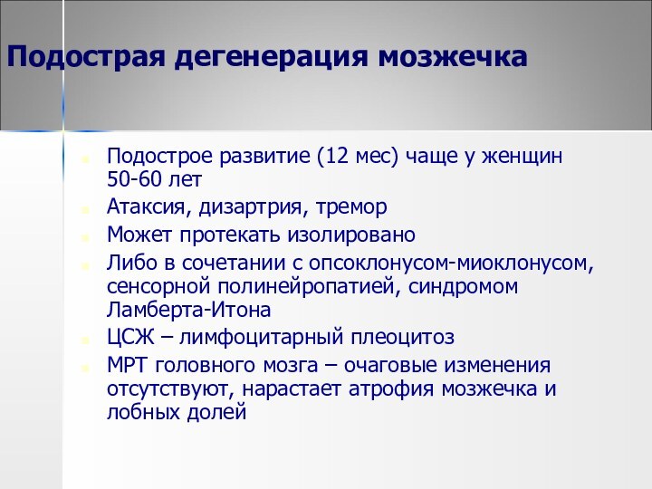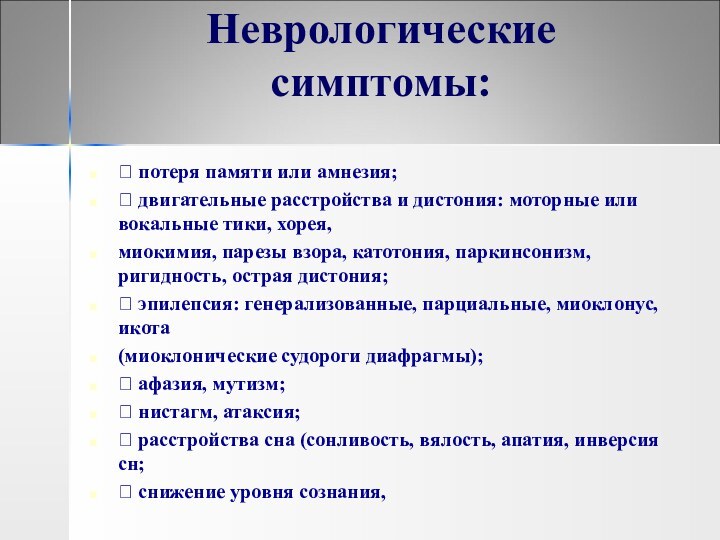Прогрессирование неврологических и психических расстройств в течение нескольких недель