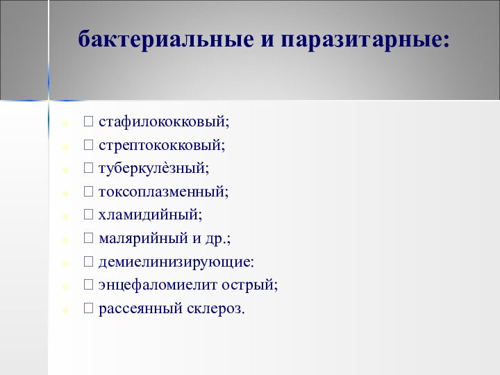 гриппозный, цитомегаловирусный, при бешенстве и др.;