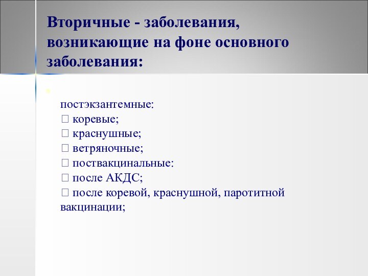 Вторичные - заболевания, возникающие на фоне основного заболевания: