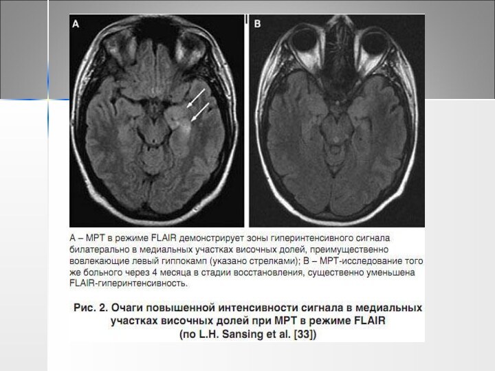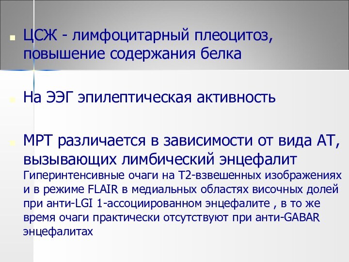 лимбический энцефалит Гиперинтенсивные очаги на Т2-взвешенных изображениях и в режиме FLAIR в медиальных областях височных долей при анти-LGI 1-ассоциированном энцефалите , в то же время очаги практически отсутствуют при анти-GABAR энцефалитах