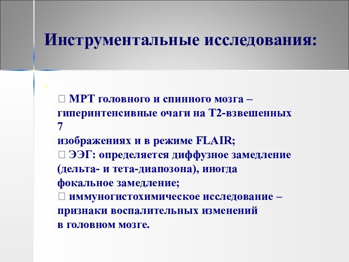 ЦСЖ – лимфоцитарный плеоцитоз, повышение уровня белка и индекса иммуноглобулинов класса G, олигоклональных иммуноглобулинов и специфических АТ