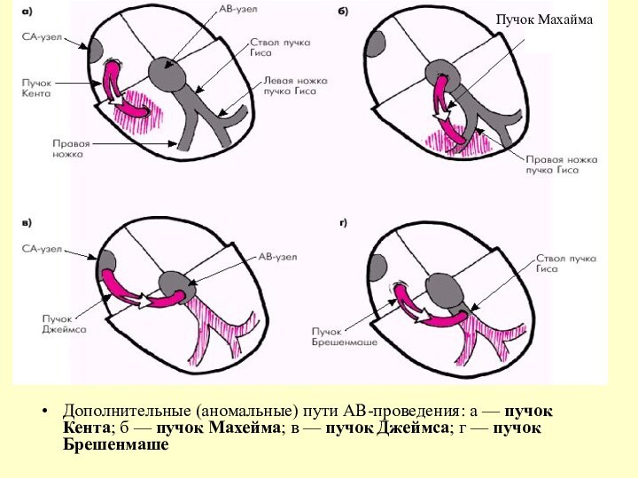 Дополнительные (аномальные) пути АВ-проведения: а — пучок Кента;