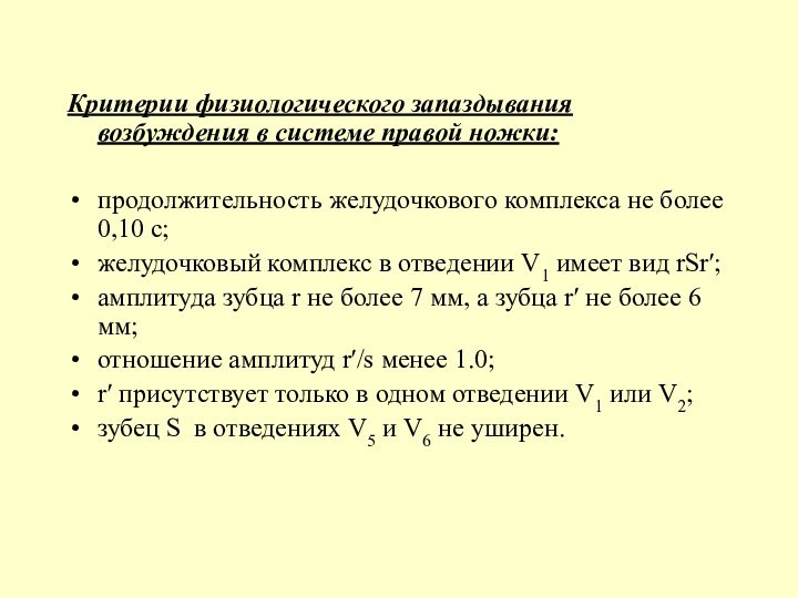 Критерии физиологического запаздывания возбуждения в системе правой ножки: