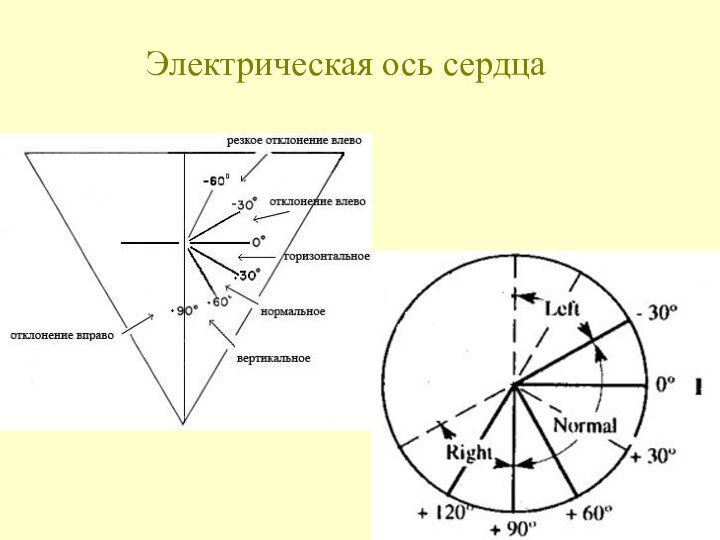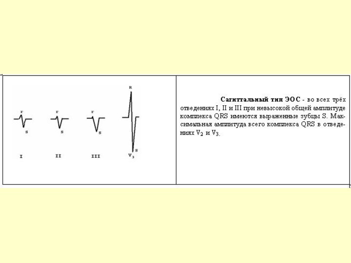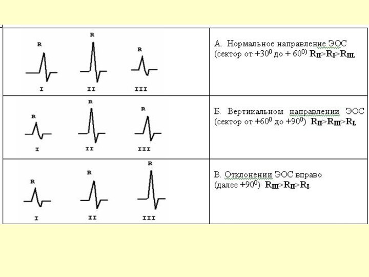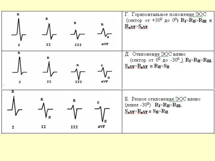- Отклонение электрической оси сердца влево (от –30° до –90°). Низкий зубец R и глубокий зубец S в отведениях II, III и aVF. Высокий зубец R в отведениях I и aVL.
