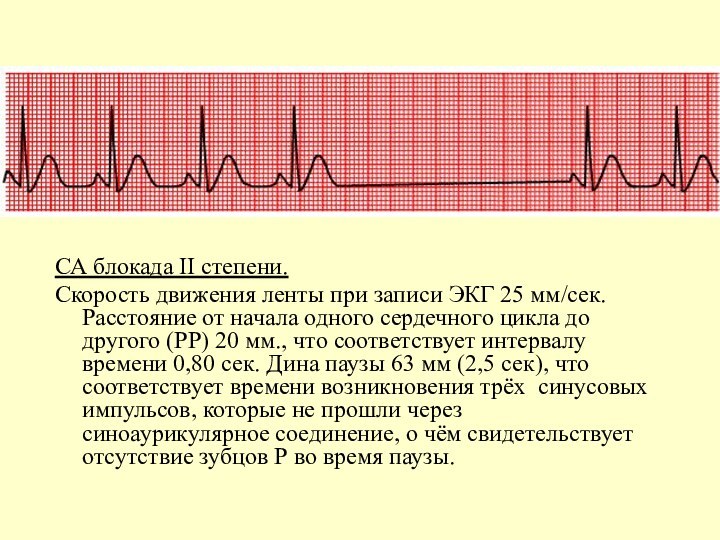 цикла до другого (РР) 20 мм., что соответствует интервалу времени 0,80 сек. Дина паузы 63 мм (2,5 сек), что соответствует времени возникновения трёх синусовых импульсов, которые не прошли через синоаурикулярное соединение, о чём свидетельствует отсутствие зубцов Р во время паузы.
