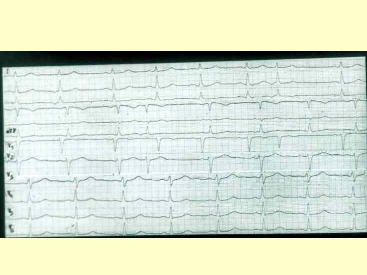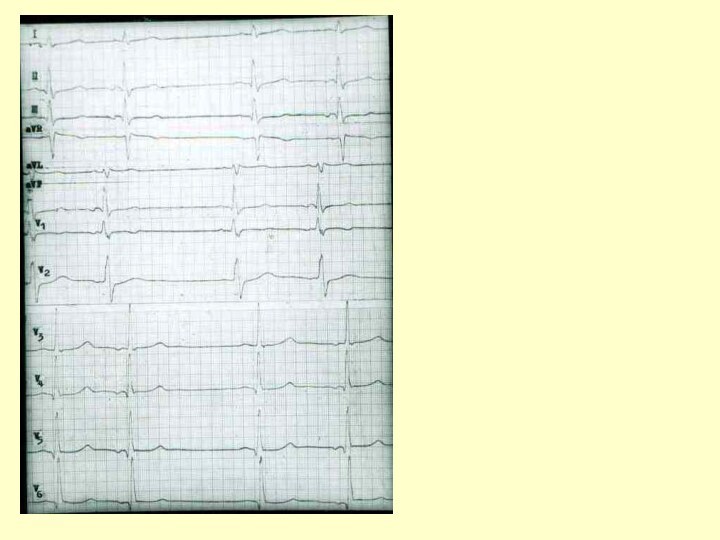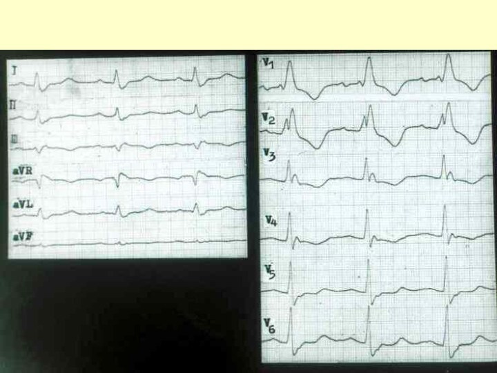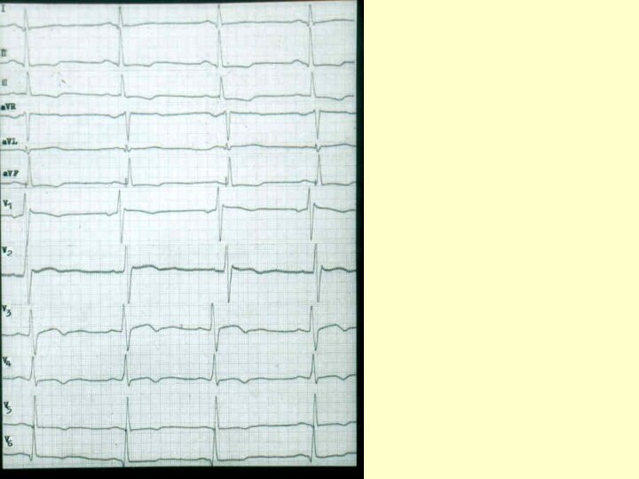 в правых грудных отведениях сегмент ST смещён вниз и при этом он имеет форму выпуклой вверх дуги. Зубец Т отрицательный.