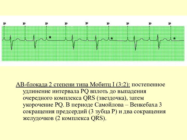 периоде Самойлова – Венкебаха 3 сокращения предсердий (3 зубца Р) и два сокращения желудочков (2 комплекса QRS).