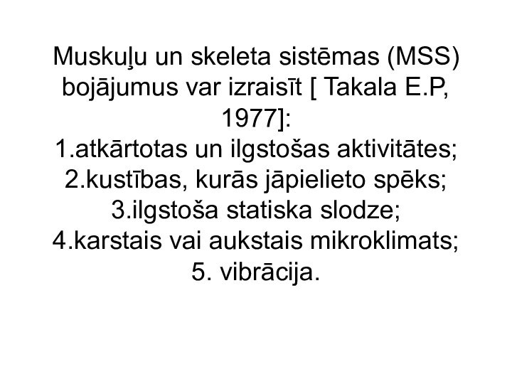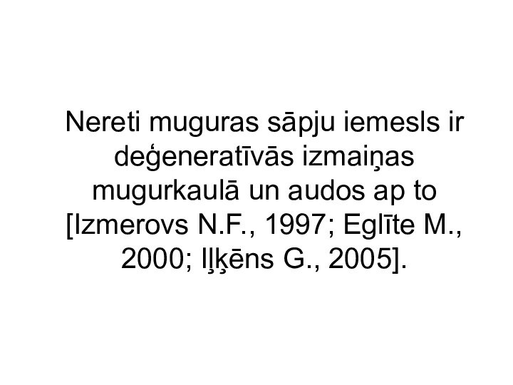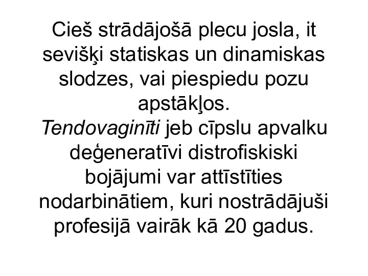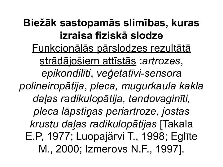 kakla daļas radikulopātija, tendovaginīti, pleca lāpstiņas periartroze, jostas krustu daļas radikulopātijas [Takala E.P, 1977; Luopajärvi T., 1998; Eglīte M., 2000; Izmerovs N.F., 1997].