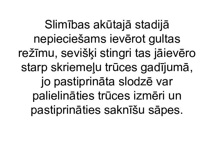 Slimības akūtajā stadijā nepieciešams ievērot gultas režīmu, sevišķi