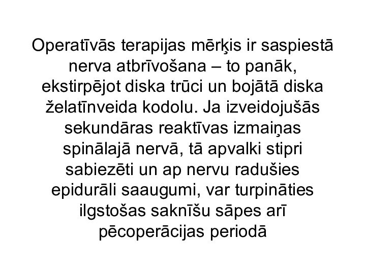kodolu. Ja izveidojušās sekundāras reaktīvas izmaiņas spinālajā nervā, tā apvalki stipri sabiezēti un ap nervu radušies epidurāli saaugumi, var turpināties ilgstošas saknīšu sāpes arī pēcoperācijas periodā