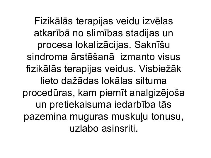 terapijas veidus. Visbiežāk lieto dažādas lokālas siltuma procedūras, kam piemīt analgizējoša un pretiekaisuma iedarbība tās pazemina muguras muskuļu tonusu, uzlabo asinsriti.