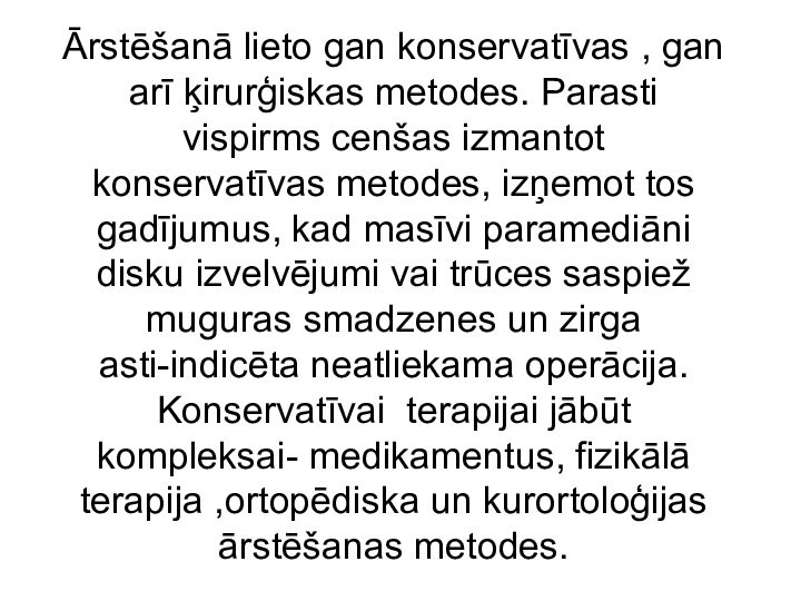 gadījumus, kad masīvi paramediāni disku izvelvējumi vai trūces saspiež muguras smadzenes un zirga asti-indicēta neatliekama operācija. Konservatīvai terapijai jābūt kompleksai- medikamentus, fizikālā terapija ,ortopēdiska un kurortoloģijas ārstēšanas metodes.