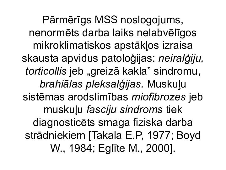 kakla” sindromu, brahiālas pleksalģijas. Muskuļu sistēmas arodslimības miofibrozes jeb muskuļu fasciju sindroms tiek diagnosticēts smaga fiziska darba strādniekiem [Takala E.P, 1977; Boyd W., 1984; Eglīte M., 2000].