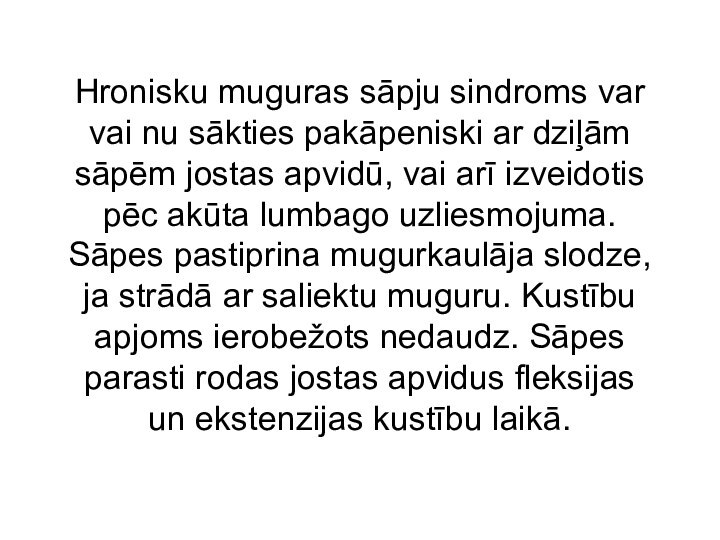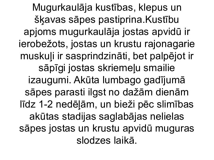 pēc akūta lumbago uzliesmojuma. Sāpes pastiprina mugurkaulāja slodze, ja strādā ar saliektu muguru. Kustību apjoms ierobežots nedaudz. Sāpes parasti rodas jostas apvidus fleksijas un ekstenzijas kustību laikā.
