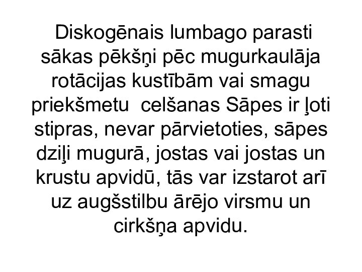vai traumatizācijas. Rodas sāpes jostas apvidū, kuras izplatās pa