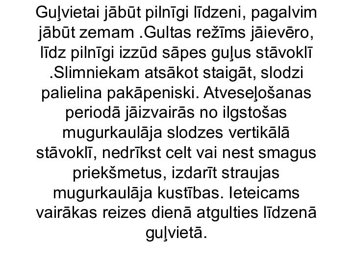 Guļvietai jābūt pilnīgi līdzeni, pagalvim jābūt zemam .Gultas