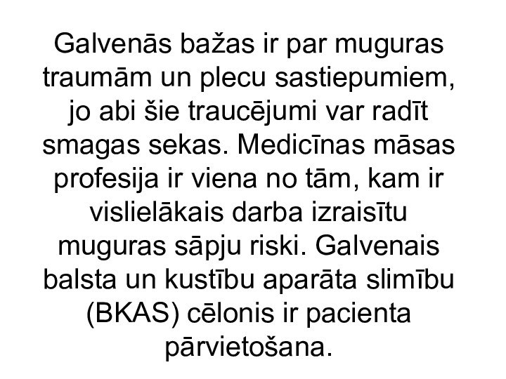 Medicīnas māsas profesija ir viena no tām, kam ir vislielākais darba izraisītu muguras sāpju riski. Galvenais balsta un kustību aparāta slimību (BKAS) cēlonis ir pacienta pārvietošana.