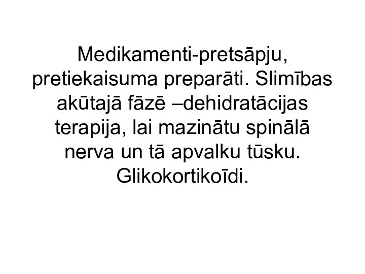 Medikamenti-pretsāpju, pretiekaisuma preparāti. Slimības akūtajā fāzē –dehidratācijas terapija,
