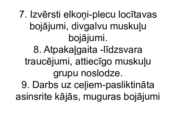 7. Izvērsti elkoņi-plecu locītavas bojājumi, divgalvu muskuļu bojājumi.