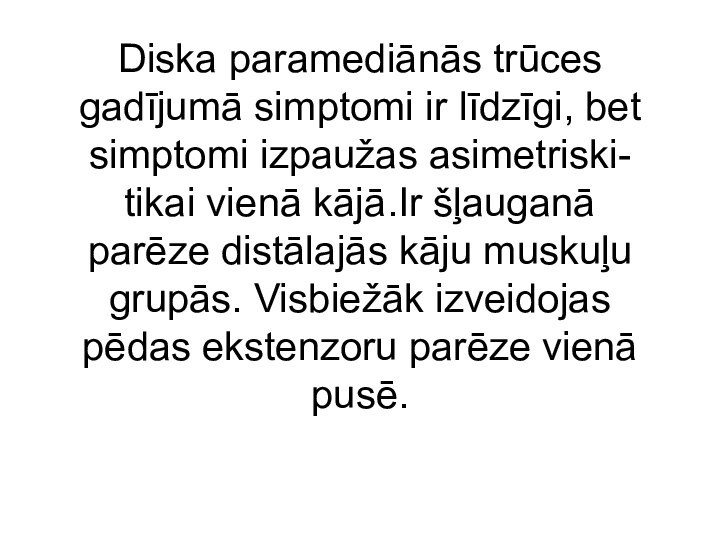 Diska paramediānās trūces gadījumā simptomi ir līdzīgi, bet