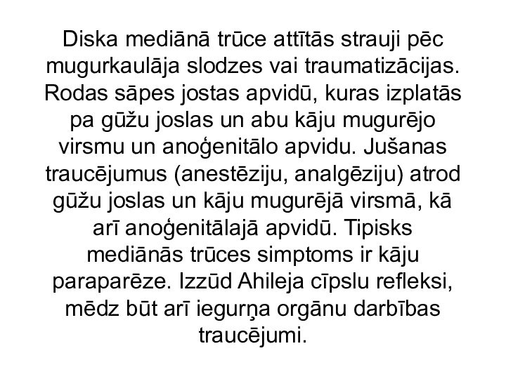 gūžu joslas un abu kāju mugurējo virsmu un anoģenitālo apvidu. Jušanas traucējumus (anestēziju, analgēziju) atrod gūžu joslas un kāju mugurējā virsmā, kā arī anoģenitālajā apvidū. Tipisks mediānās trūces simptoms ir kāju paraparēze. Izzūd Ahileja cīpslu refleksi, mēdz būt arī iegurņa orgānu darbības traucējumi.