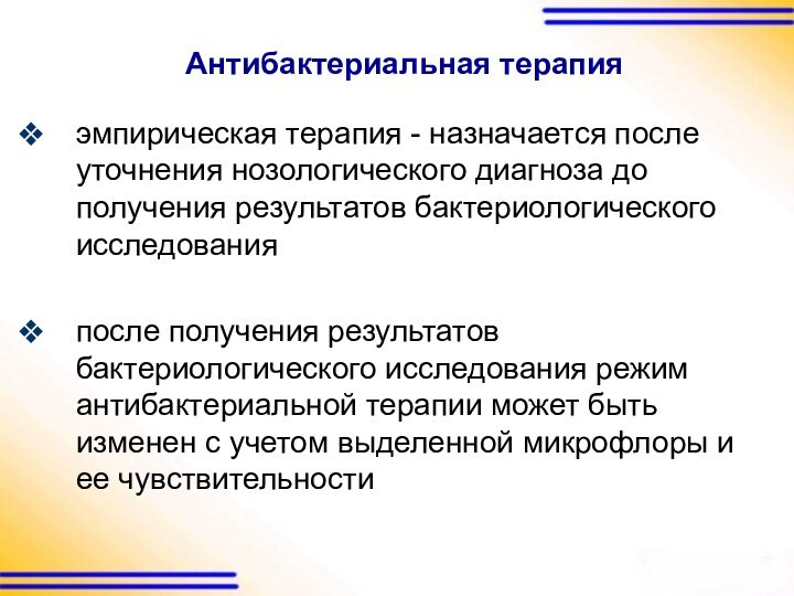 бактериологического исследования режим антибактериальной терапии может быть изменен с учетом выделенной микрофлоры и ее чувствительности