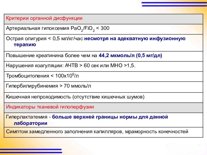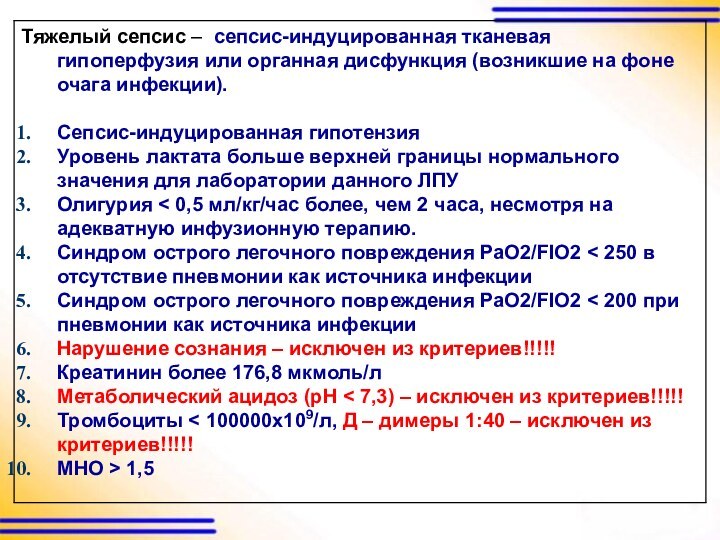 Органная недостаточность = ≥ 2 балла по qSOFA (ЧД ≥ 22, систолическое АД ≤ 100, нарушение сознания)
