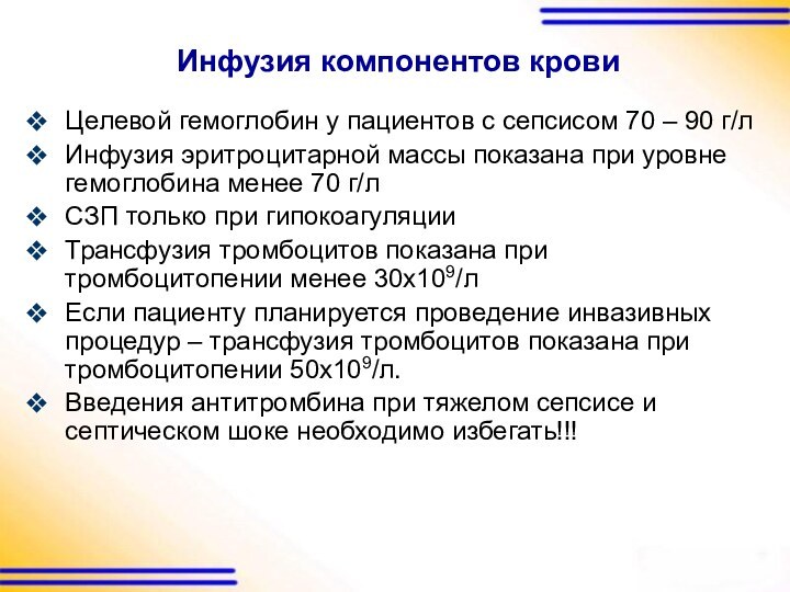 Введения антитромбина при тяжелом сепсисе и септическом шоке необходимо избегать!!!
